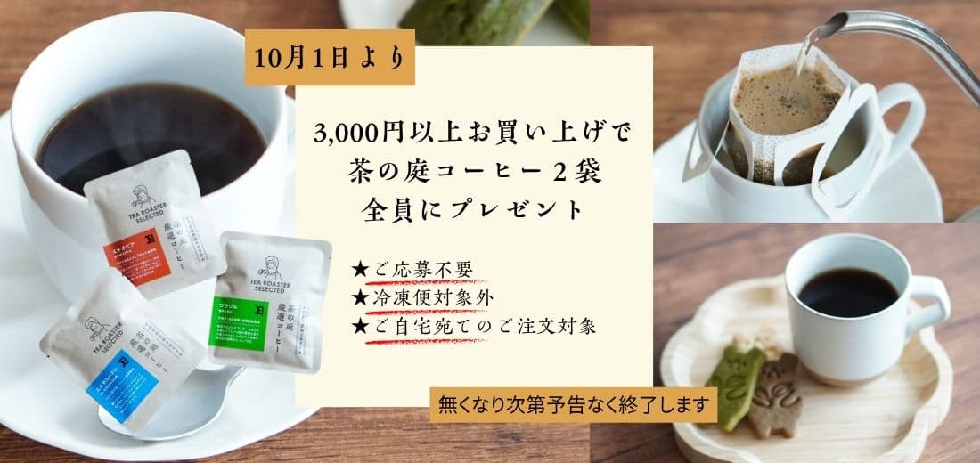 2025年10月1日(水)~10月31日(金)の期間中に茶の庭オンラインショップからご注文いただきますと、3,000円以上商品をご購入で、ご自宅宛のお荷物がある場合に限り、茶の庭ドリップコーヒーを2袋プレゼントさせていただきます。送料や手数料は金額に含まれませんので、ご注意ください。