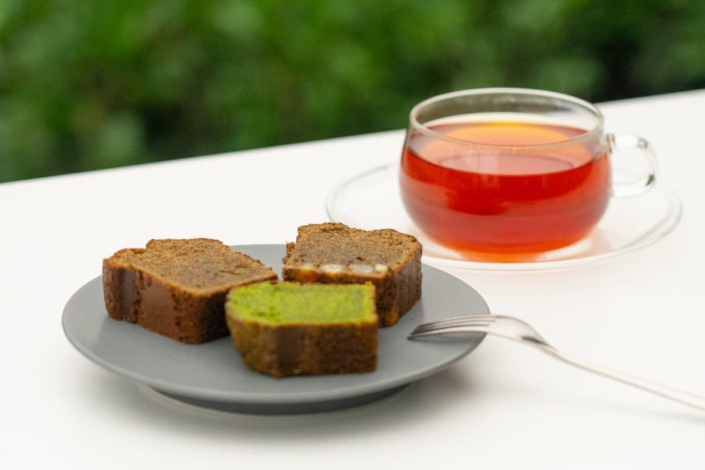 ほうじ茶ケーキには温かい煎茶を、抹茶ケーキにはミルクティーやラテもおすすめ。