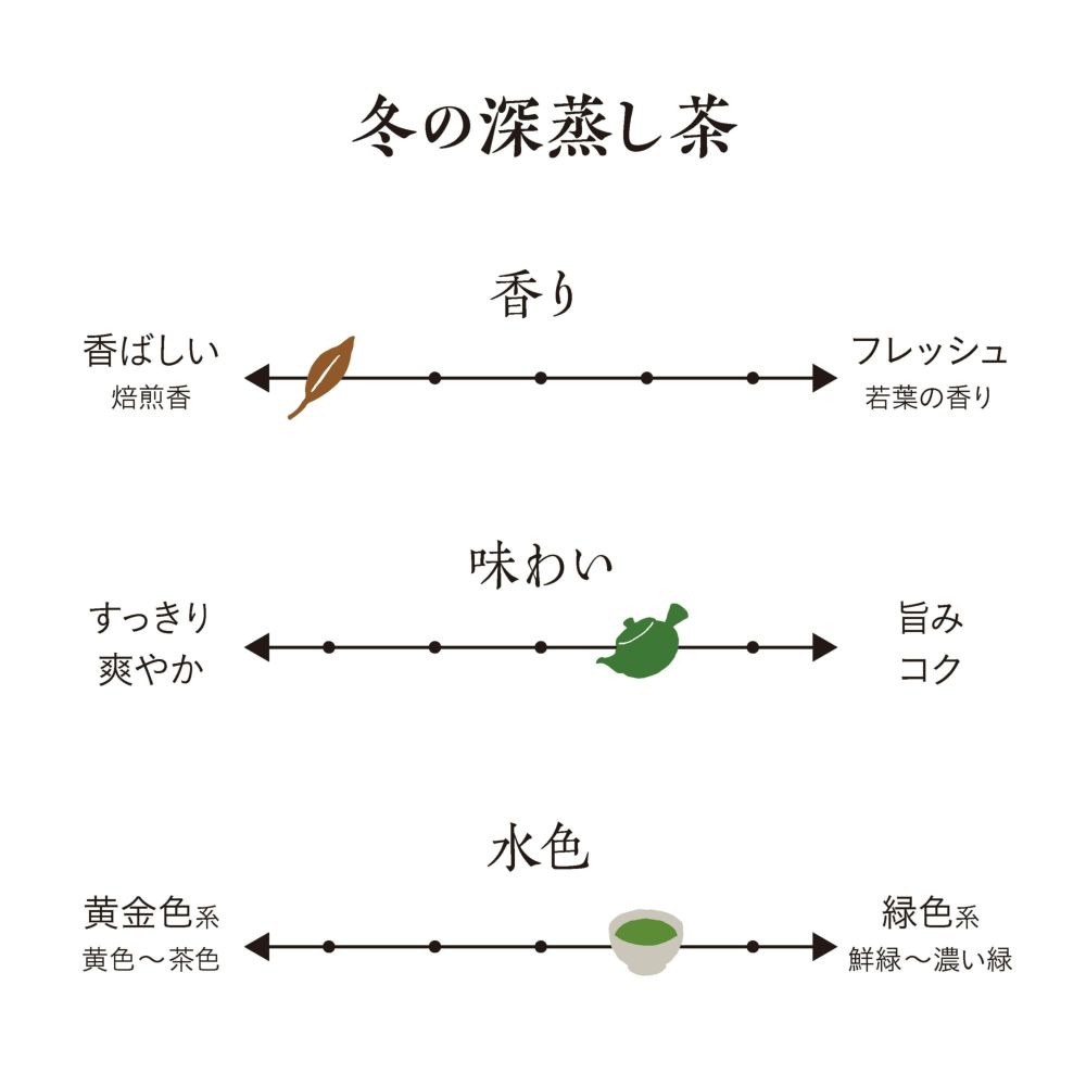 深蒸し茶は蒸す時間が長いことによってお湯に溶け出る茶の成分が多いため、茶碗に注いだ時の液色も濃い緑色となります。濃い緑色ではありますが、旨味成分が多いため渋みは少なく、まろやかでコクのある喉越しが特徴です。