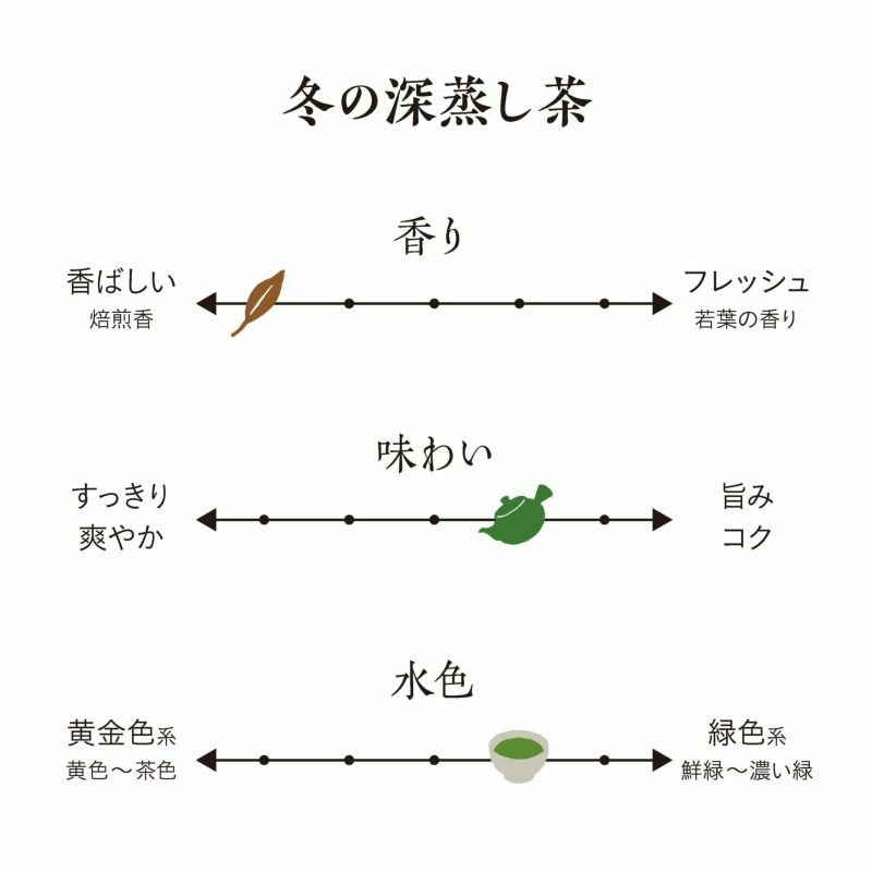焙煎強めの香ばしい「冬の深蒸し茶」は寒い冬に飲みたい深蒸し茶です。スタンダードシリーズで年間を通じて一番人気のバランスの取れた深蒸し茶「若葉摘み」とかぶせ茶をブレンドした「かごよせ」などの人気商品との飲み比べをお楽しみください。