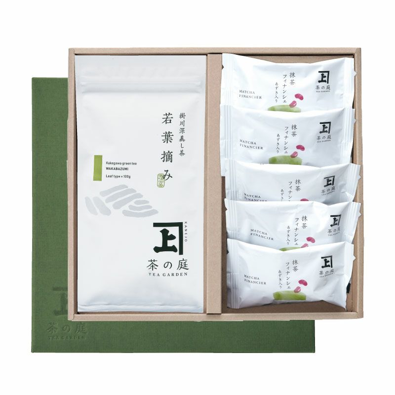味わいのバランスが取れたお茶「若葉摘み」1袋と、抹茶フィナンシェ5個セットのギフトセットはお祝い・御礼の品など、感謝の気持ちを伝える贈り物に人気です。