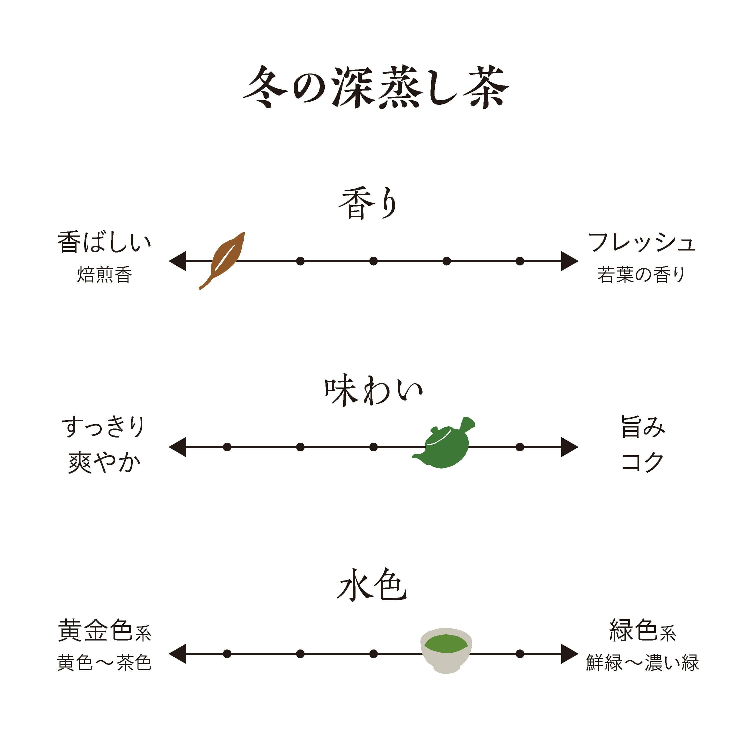 ほっと温まる、焙煎香が豊かな冬限定茶と人気のお茶を飲み比べ 冬の深蒸し茶1袋 茶作り名人の深むし茶2袋セット