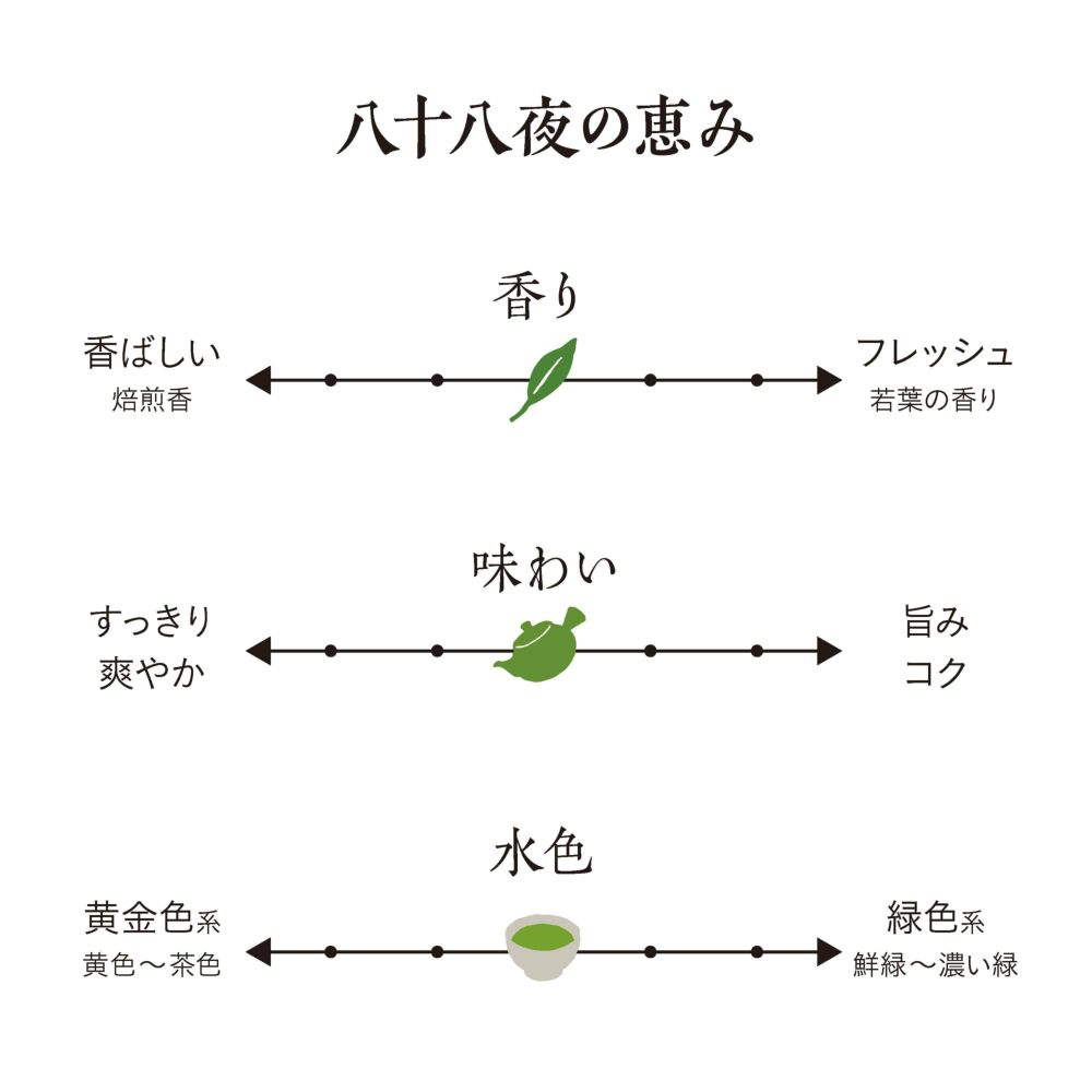 深蒸し茶は蒸す時間が長いことによってお湯に溶け出る茶の成分が多いため、茶碗に注いだ時の液色も濃い緑色となります。濃い緑色ではありますが、旨味成分が多いため渋みは少なく、まろやかでコクのある喉越しが特徴です。