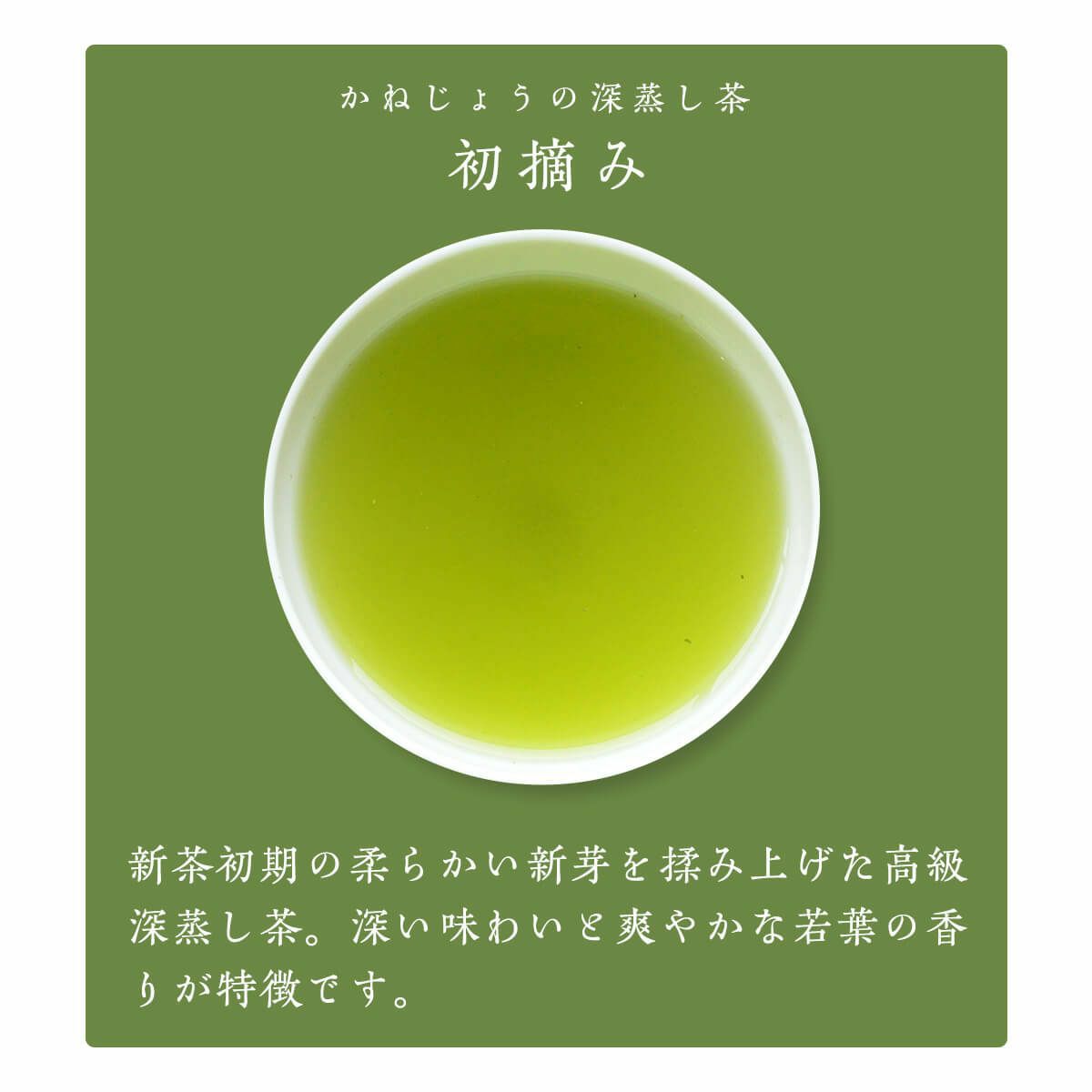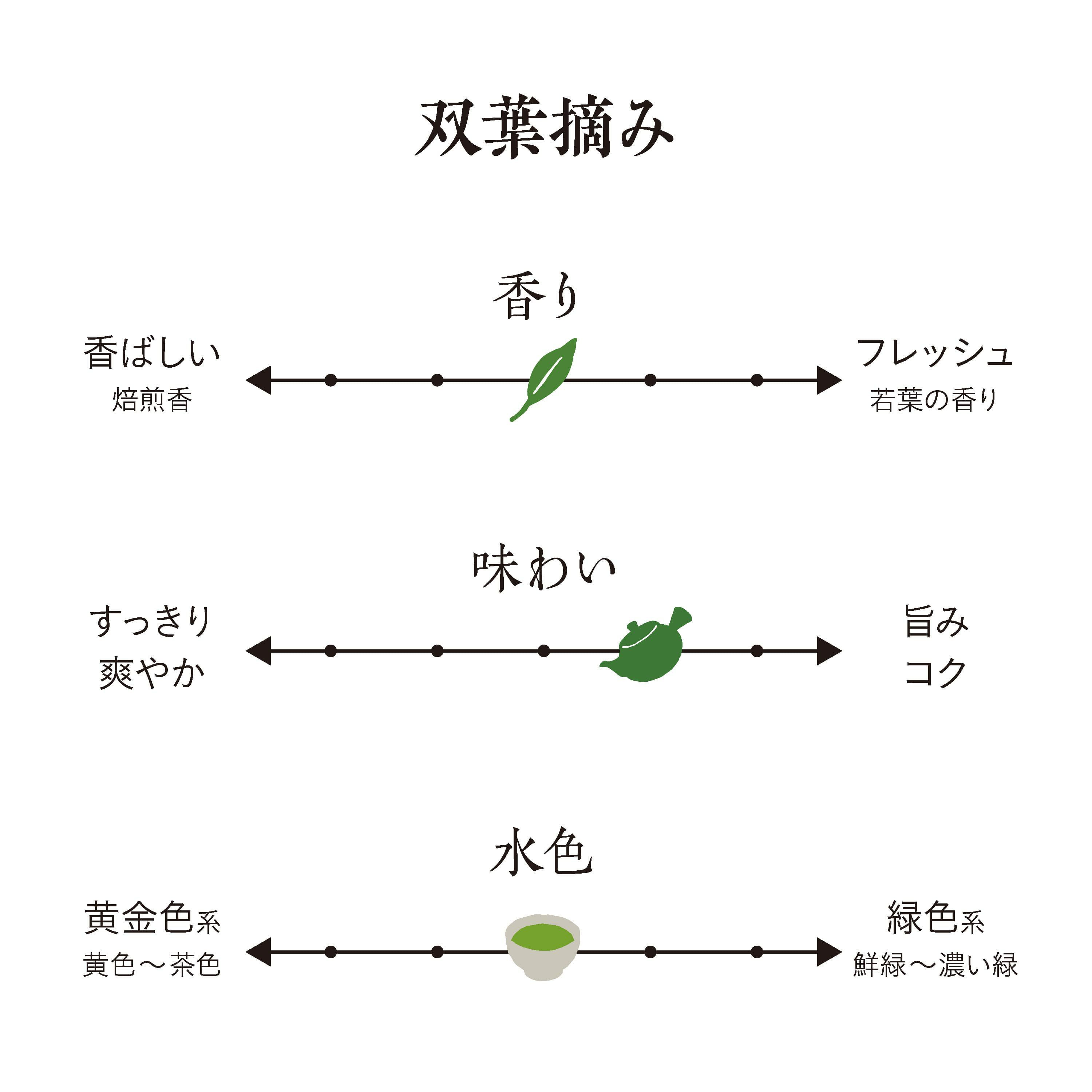 深蒸し茶は蒸す時間が長いことによってお湯に溶け出る茶の成分が多いため、茶碗に注いだ時の液色も濃い緑色となります。濃い緑色ではありますが、旨味成分が多いため渋みは少なく、まろやかでコクのある喉越しが特徴です。