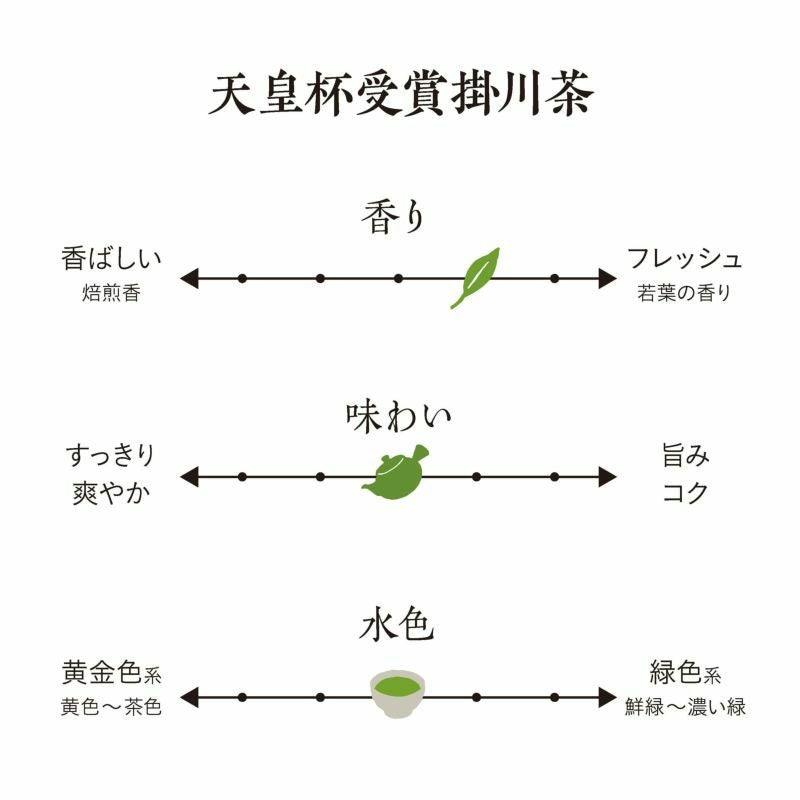 第59回農林水産大臣祭「天皇杯」&第74回全国茶品評会「農林水産大臣賞」受賞工場のお茶を、お茶の名産地「静岡県」の仕上げ技術競技会で優勝した最高金賞受賞茶師が仕上げた特別な深蒸し掛川茶です。