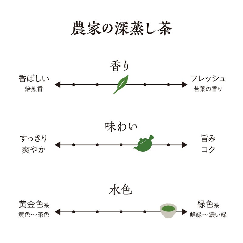 甘みの強いかぶせ茶をブレンドしているため、甘みがあり、色が濃く、味も濃いのが特徴です。