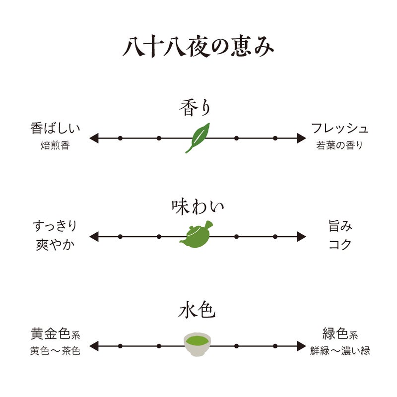 立春から数えて八十八日前後に摘んだ深蒸し茶です。昔から八十八夜のお茶は味が濃くなる特徴があります。