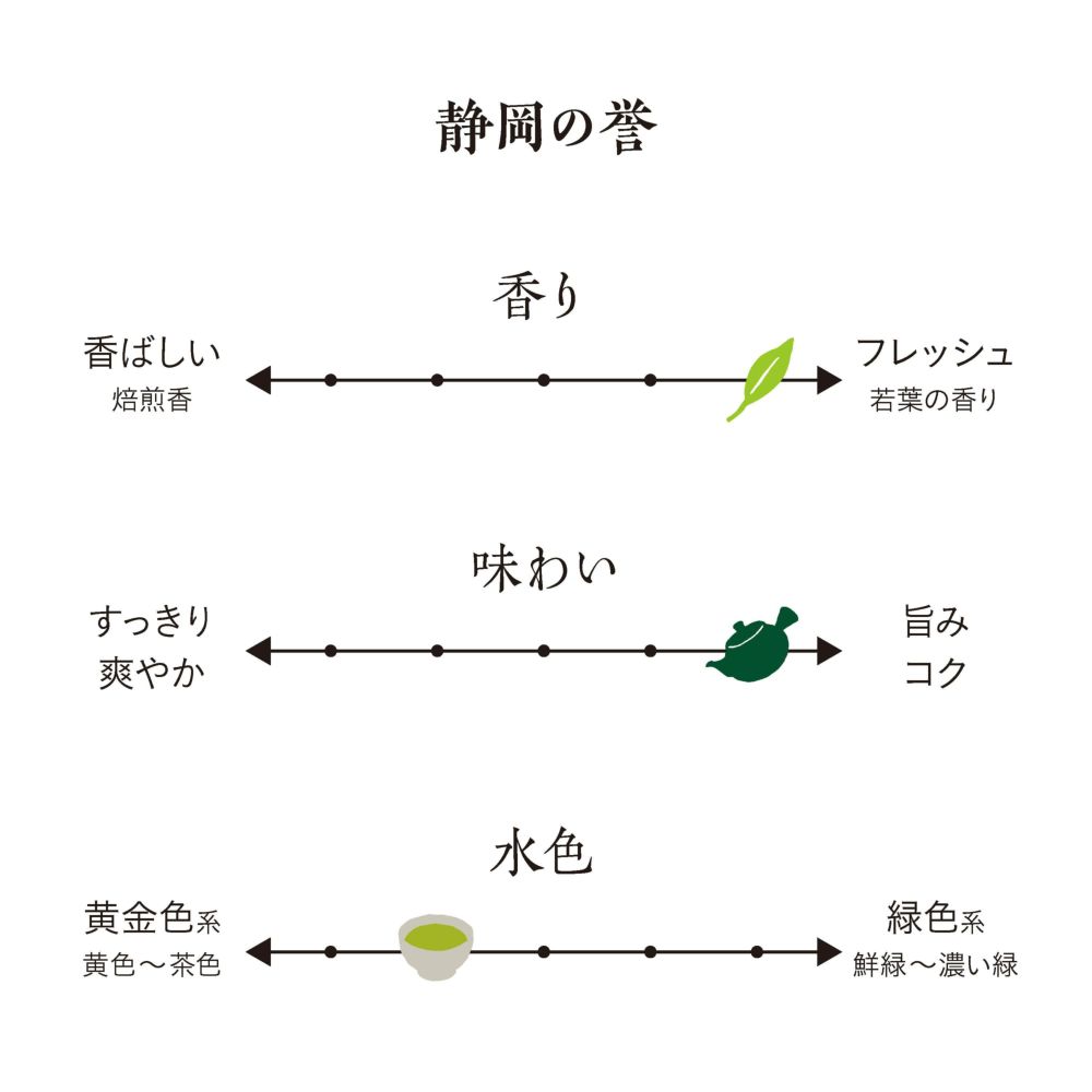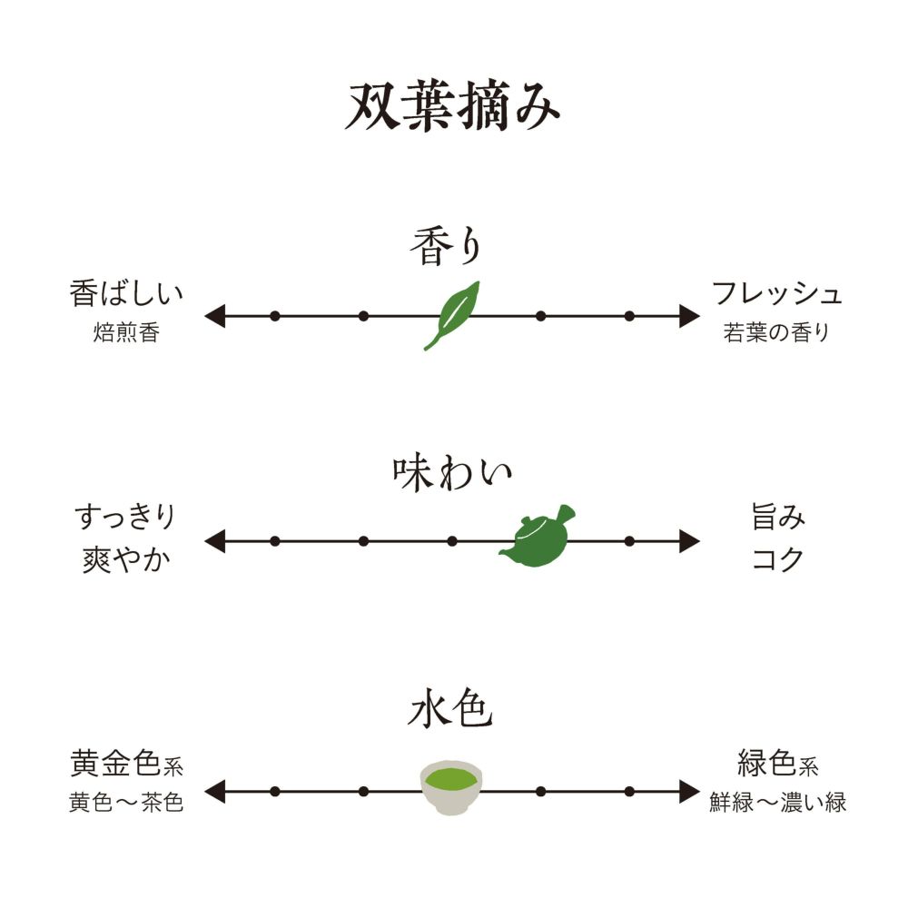 深蒸し茶は蒸す時間が長いことによってお湯に溶け出る茶の成分が多いため、茶碗に注いだ時の液色も濃い緑色となります。濃い緑色ではありますが、旨味成分が多いため渋みは少なく、まろやかでコクのある喉越しが特徴です。