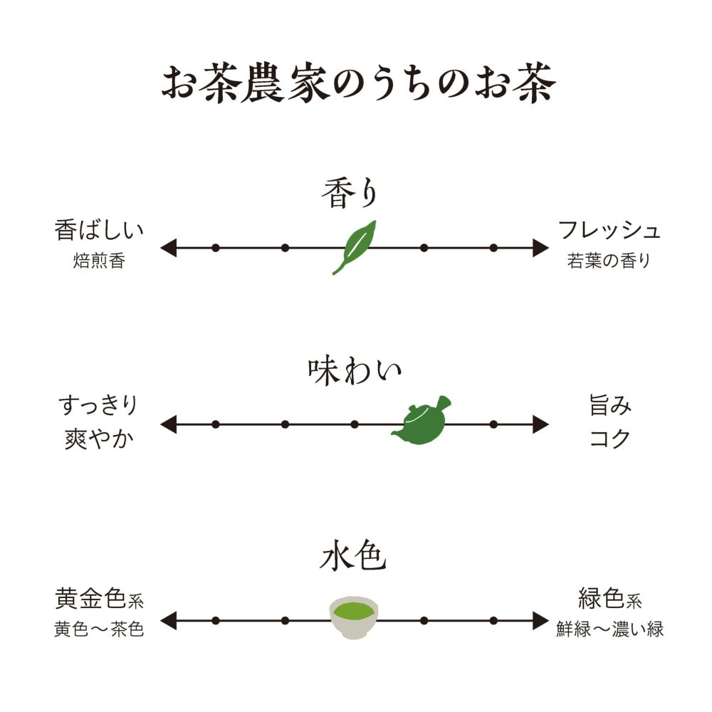 深蒸し茶は蒸す時間が長いことによってお湯に溶け出る茶の成分が多いため、茶碗に注いだ時の液色も濃い緑色となります。濃い緑色ではありますが、旨味成分が多いため渋みは少なく、まろやかでコクのある喉越しが特徴です。