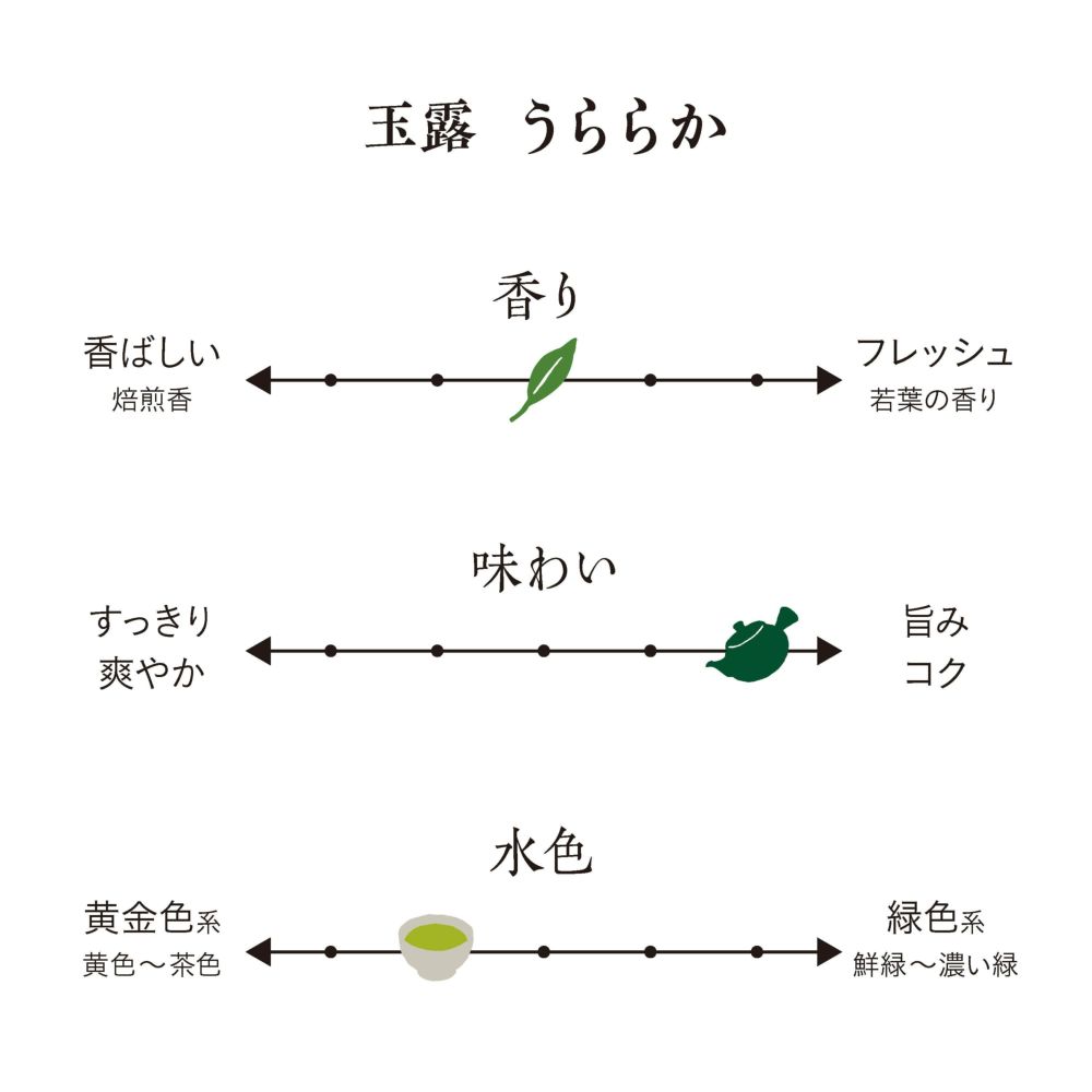 深蒸し茶は蒸す時間が長いことによってお湯に溶け出る茶の成分が多いため、茶碗に注いだ時の液色も濃い緑色となります。濃い緑色ではありますが、旨味成分が多いため渋みは少なく、まろやかでコクのある喉越しが特徴です。