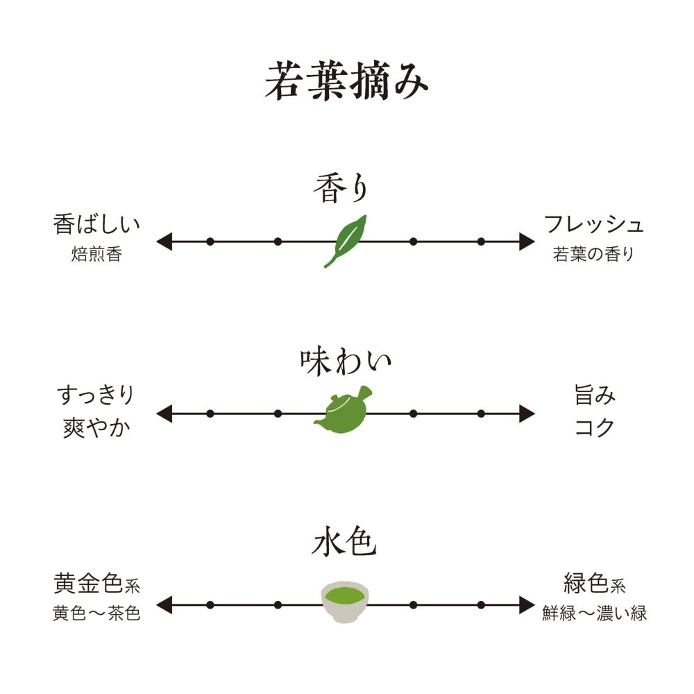 深蒸し茶は蒸す時間が長いことによってお湯に溶け出る茶の成分が多いため、茶碗に注いだ時の液色も濃い緑色となります。濃い緑色ではありますが、旨味成分が多いため渋みは少なく、まろやかでコクのある喉越しが特徴です。