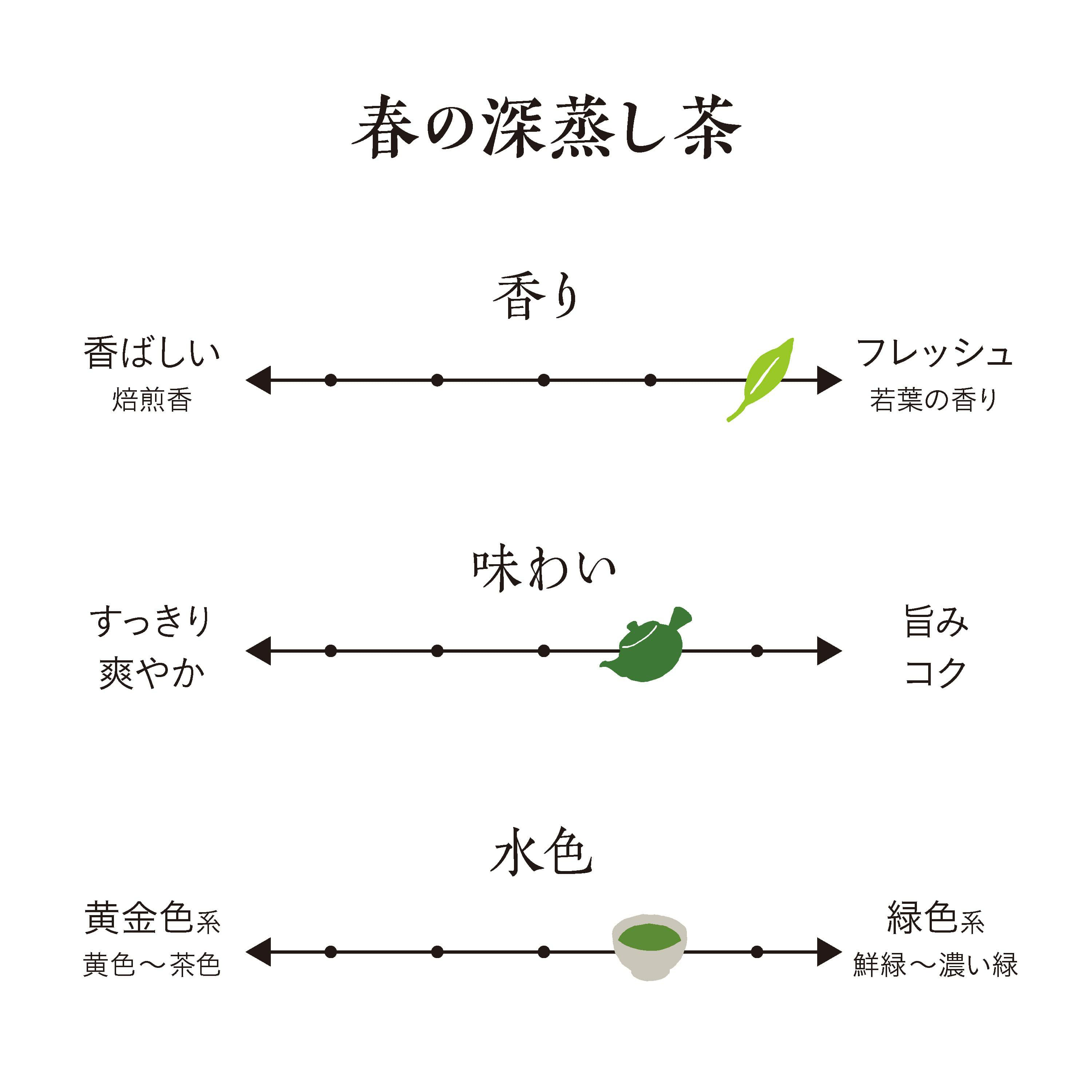 深蒸し茶は蒸す時間が長いことによってお湯に溶け出る茶の成分が多いため、茶碗に注いだ時の液色も濃い緑色となります。濃い緑色ではありますが、旨味成分が多いため渋みは少なく、まろやかでコクのある喉越しが特徴です。